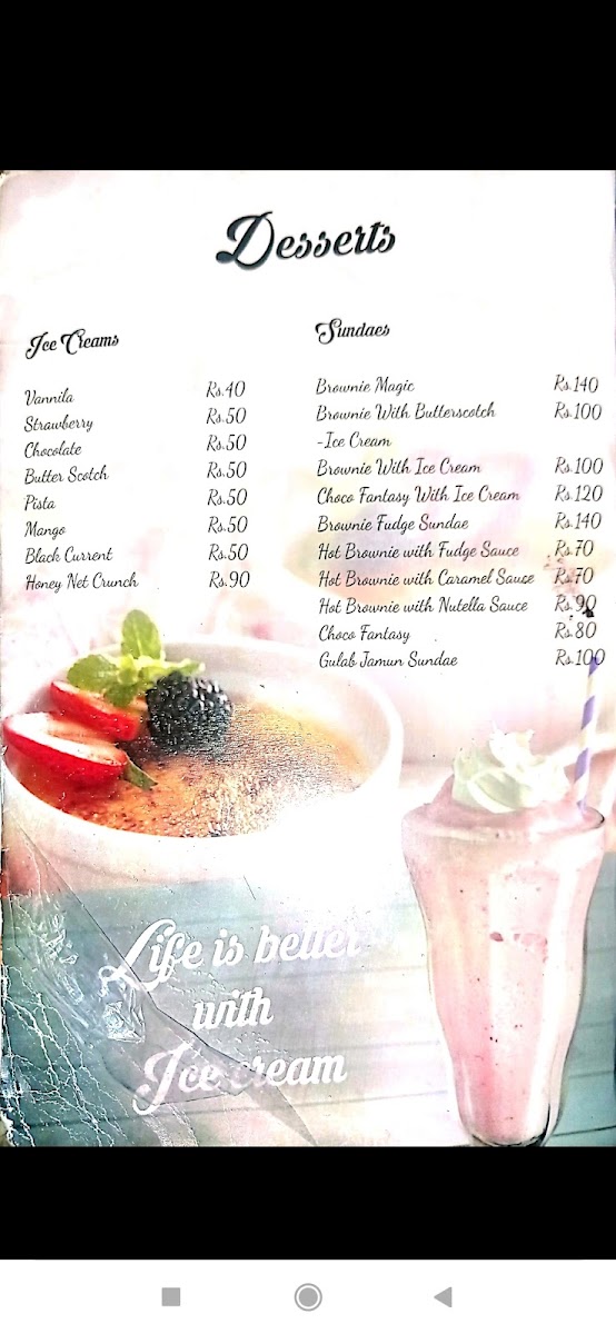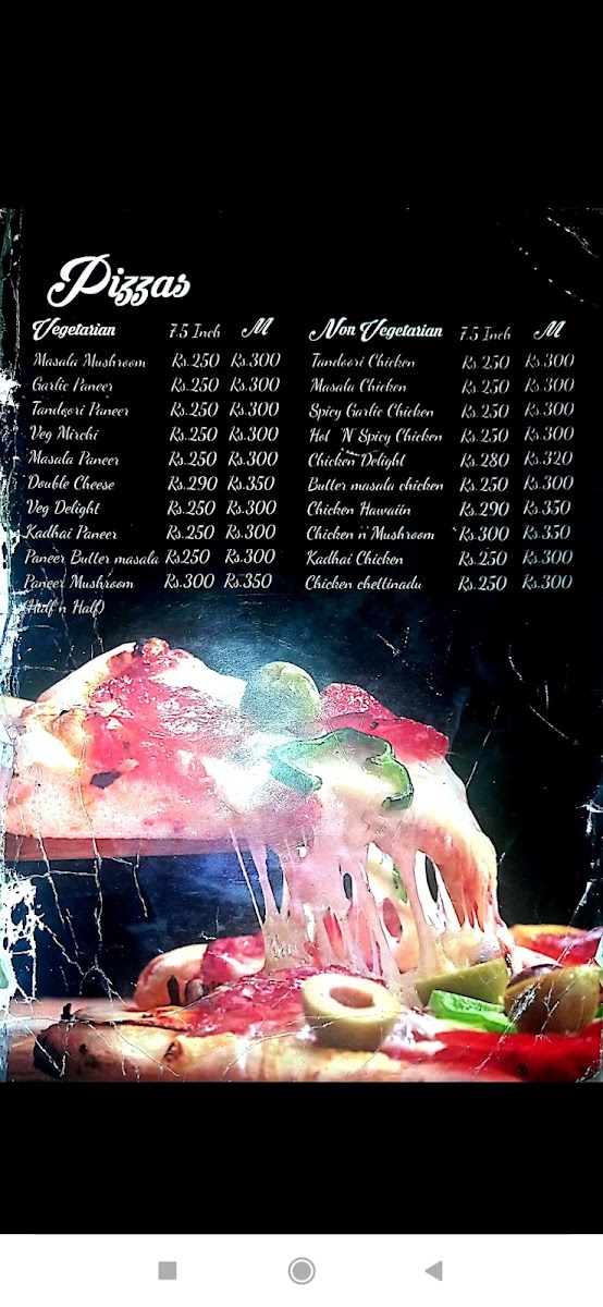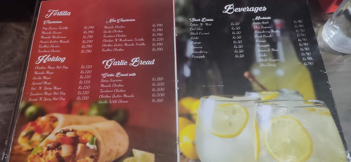 The menu offers a variety of items suitable for different times of the day, including breakfast, coffee breaks, and light meals. It features a selection of light food options such as sandwiches, garlic bread with cheese, fried momos, and hot dogs. Customers can also find a variety of pizza choices, including garlic paneer and chicken grilled pizzas. Beverages include coffee and likely other café-style drinks to complement the food items.