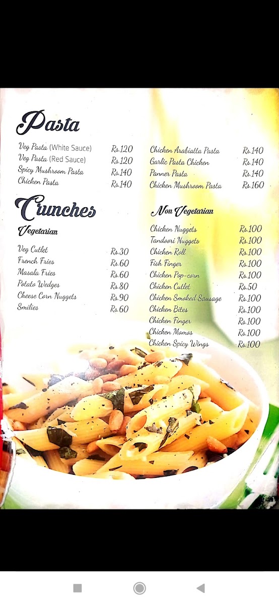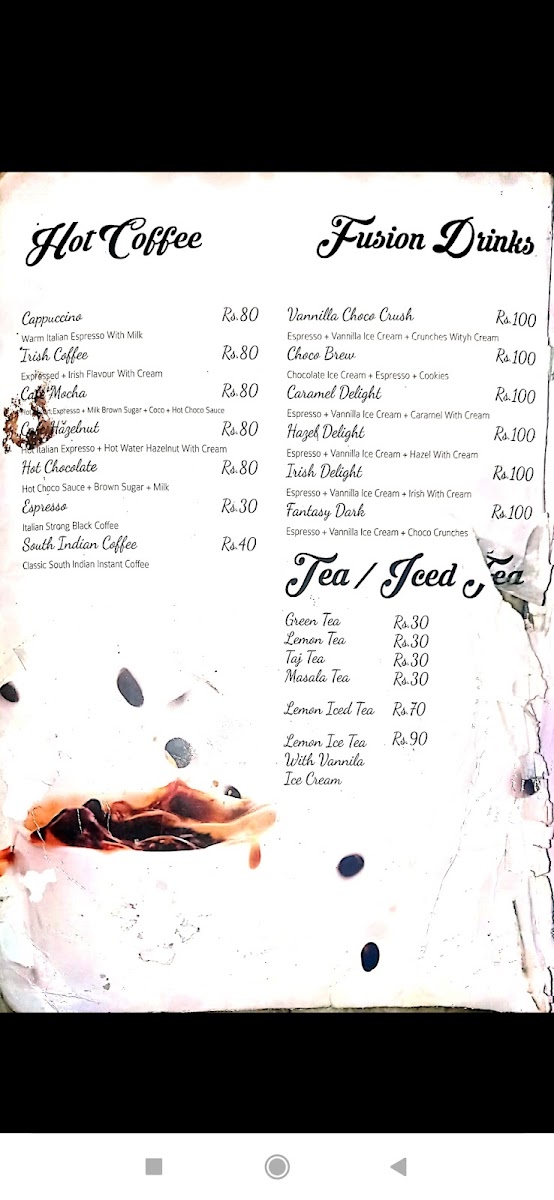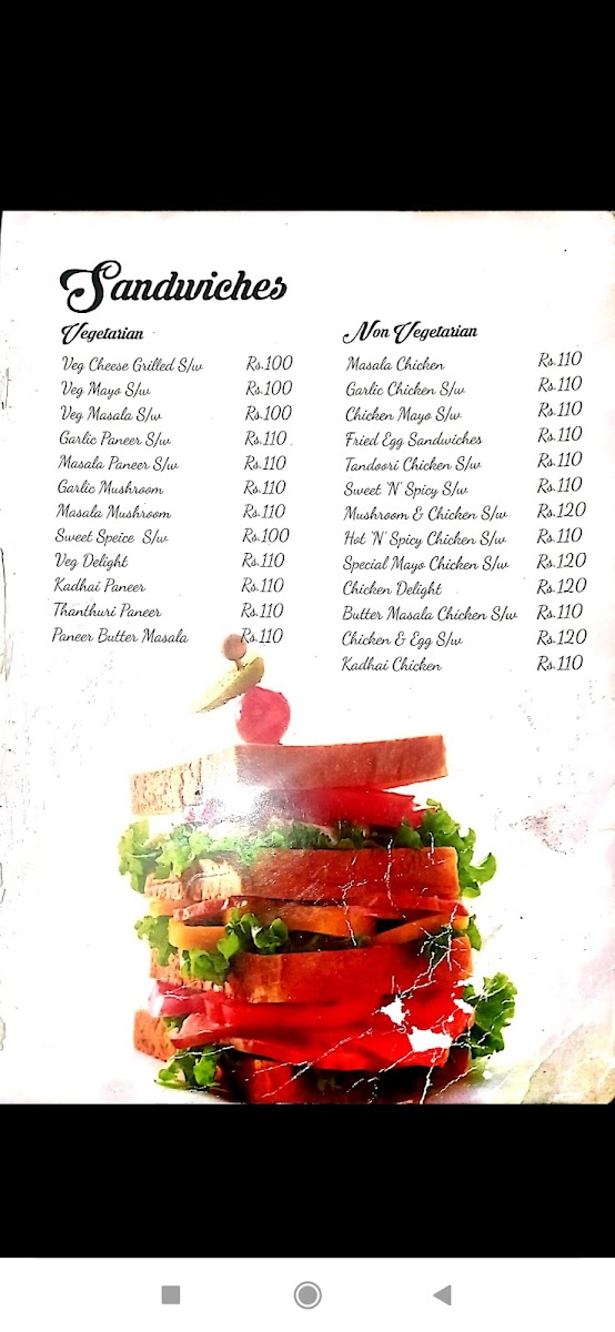 The menu is organized to cater to quick orders as well as casual dining experiences, with a focus on snacks and light meals. Patrons can expect a range of savory items alongside beverages typically served in a café environment.